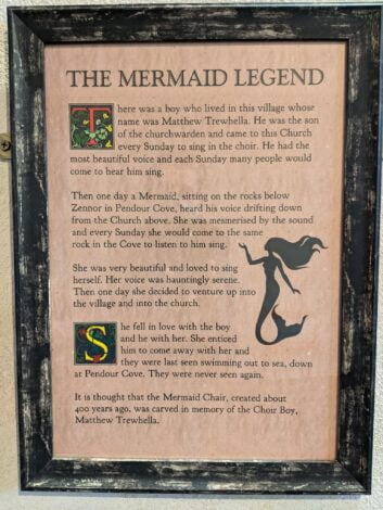 It is thought that the Mermaid Chair, created about 400 years ago, was carved in the memory of the Choir Boy, Matthew Trewhella.